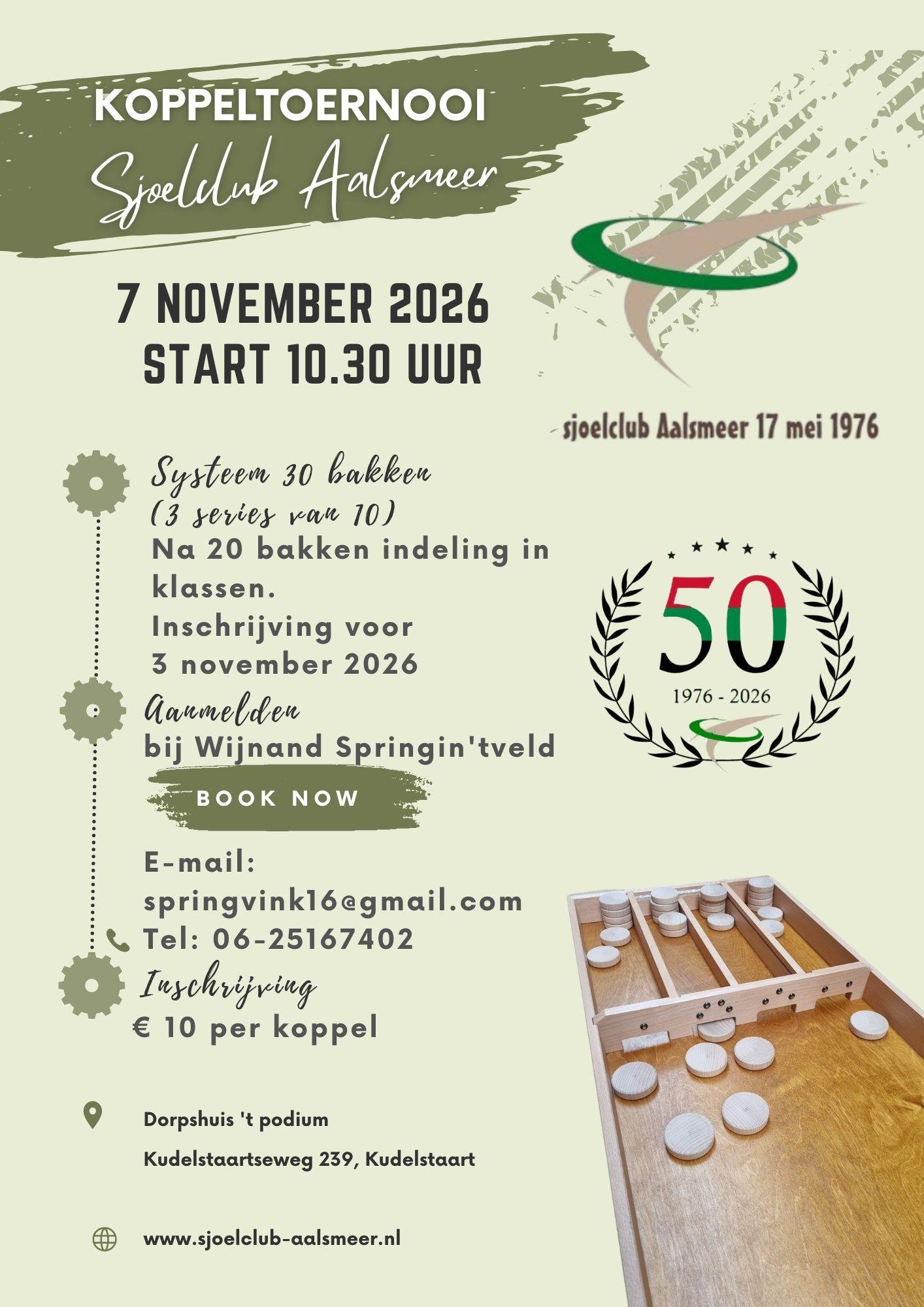 Koppeltoernooi sjoelclub Aalsmeer op 7 november 2026